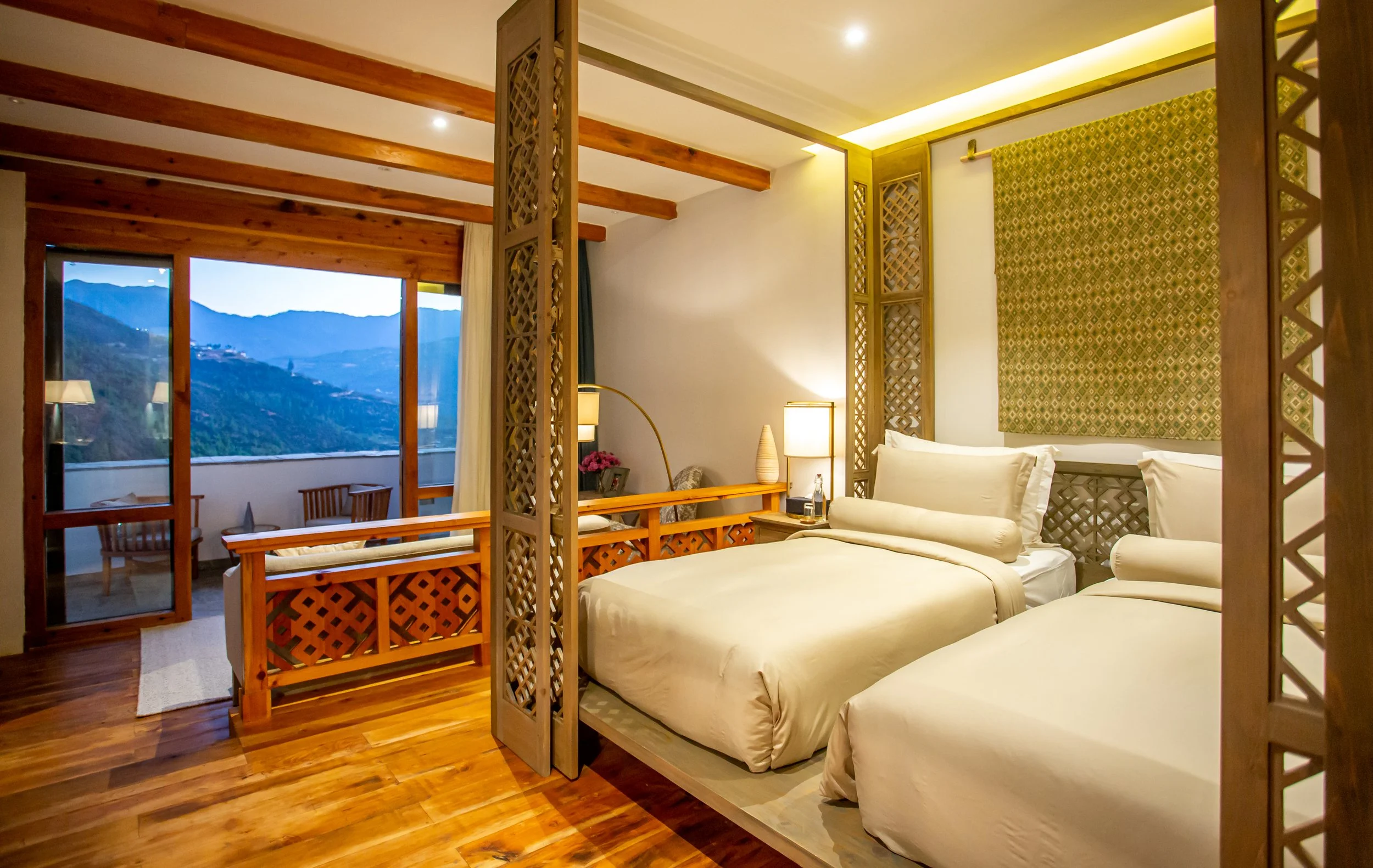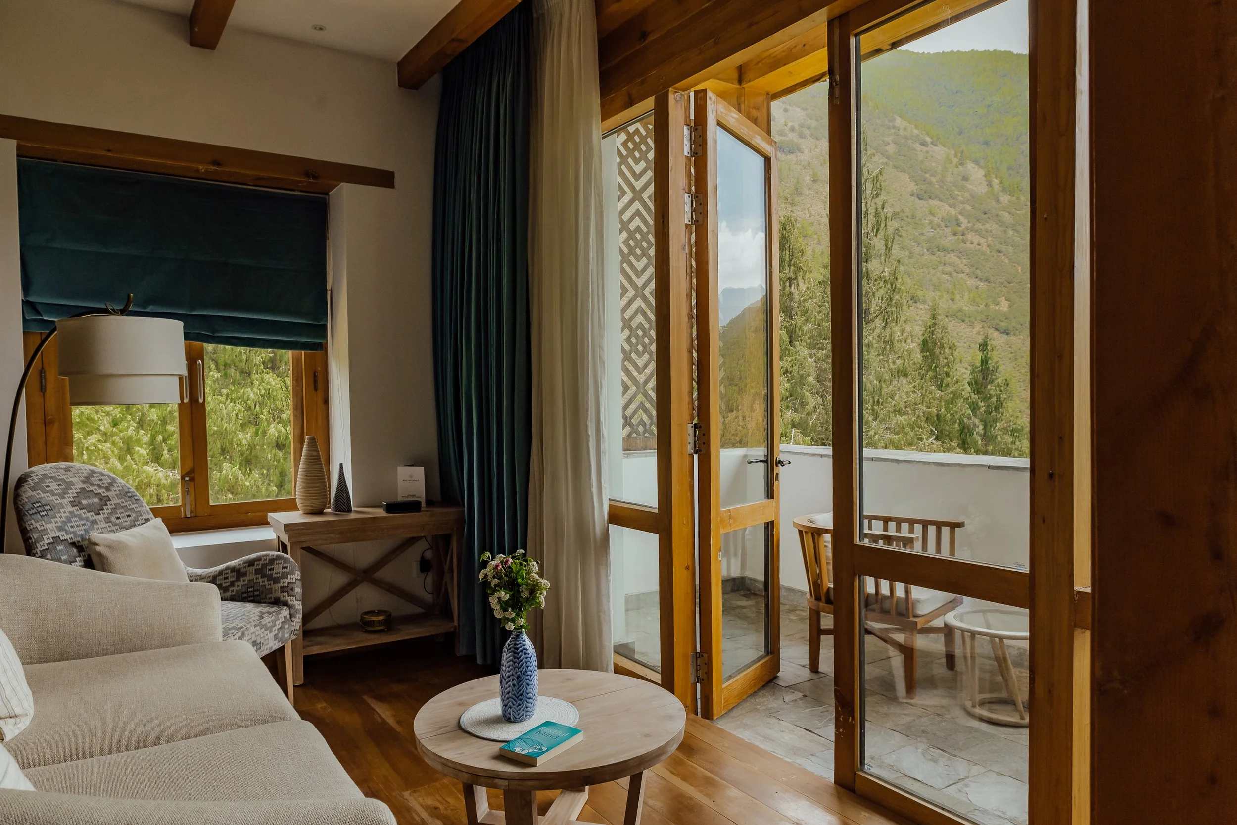 Each elegantly designed plastic-free room features a private balcony or terrace that opens to the majestic Neyphu Valley, creating a serene setting for contemplation and renewal. Combining modern comforts with traditional Bhutanese aesthetics, the rooms offer a sense of peace, simplicity, and luxury, ensuring a restful stay.